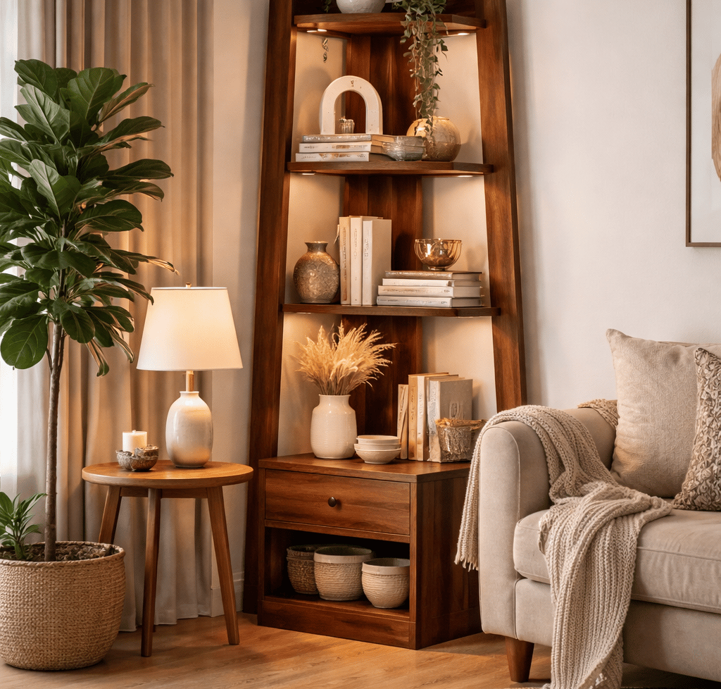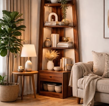 Looking to upgrade your home without spending too much? This beautiful wooden corner bookshelf is the perfect space-saving solution that adds both style and functionality to your living room. Create a cozy, aesthetic vibe with warm wood tones, soft lighting, and minimal decor. Whether you love modern interiors or rustic charm, this shelf blends perfectly into any home setup.